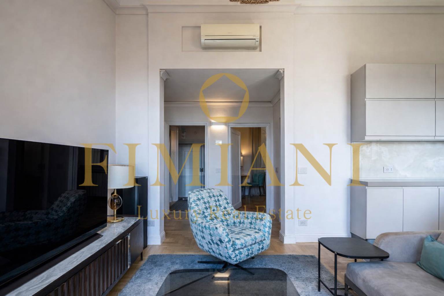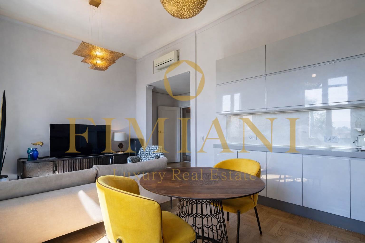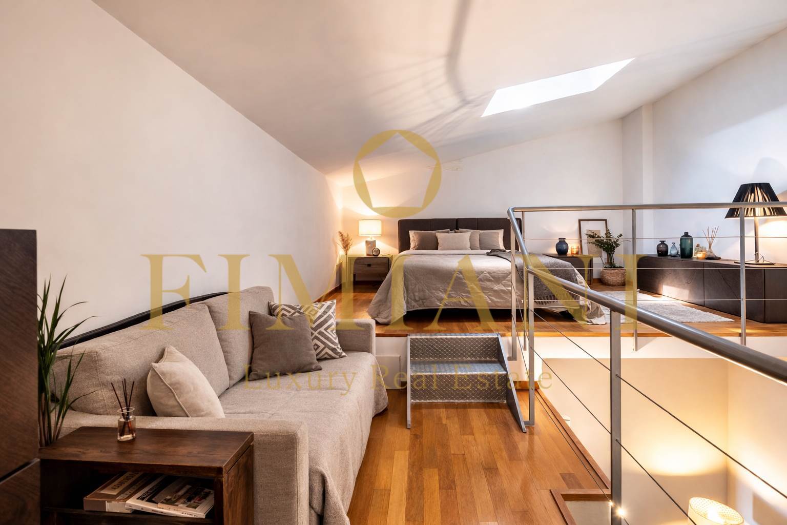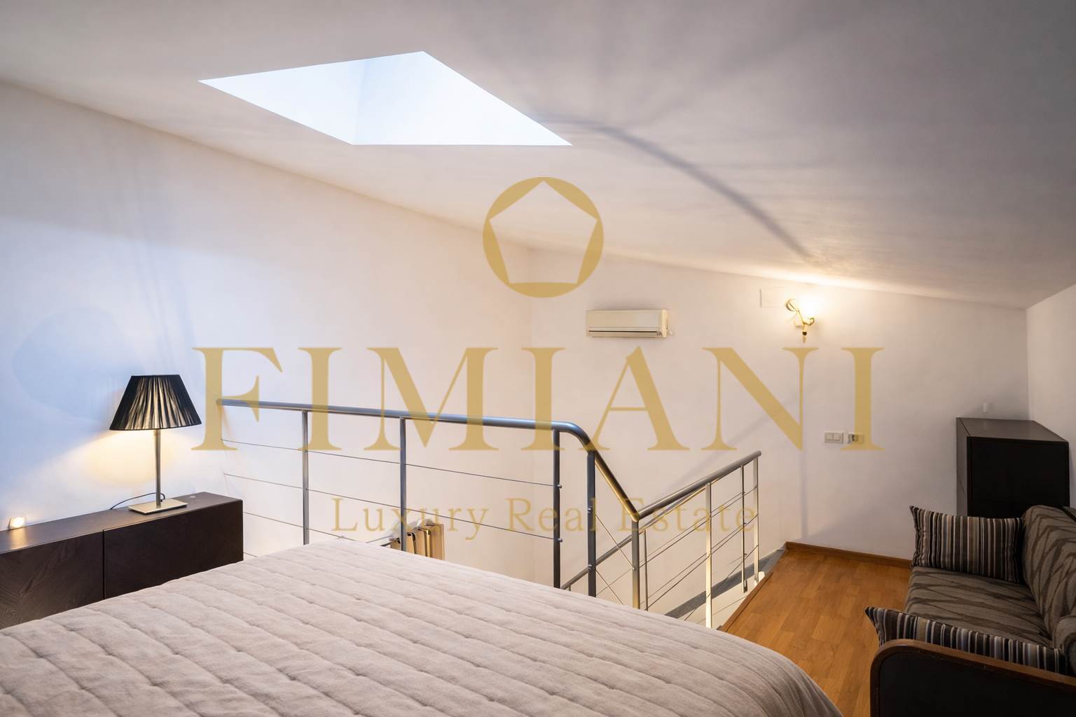 Vaulted ceilings and honey-colored wooden parquet blend beautifully with modern, minimalist furnishings.
